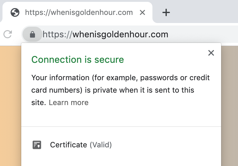 A couple months back, I spent some time sprucing whenisgoldenhour.com in two ways. The first, was setting up https for the site. Nothing special here; just used AWS ACM for the cert -- and now we have our cool green lock in your browser.